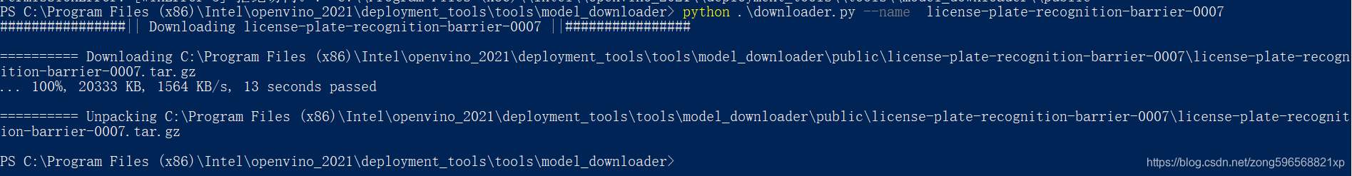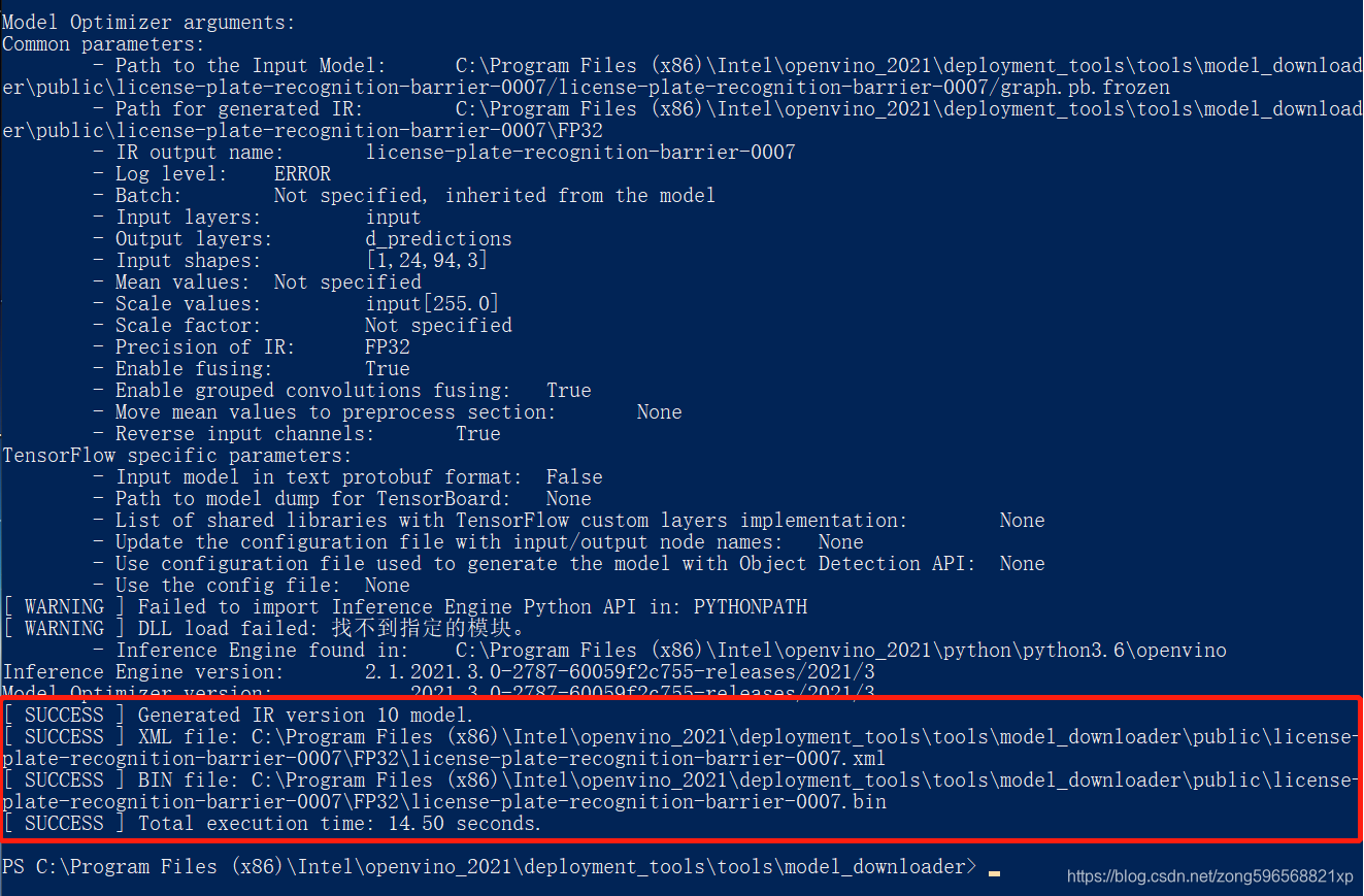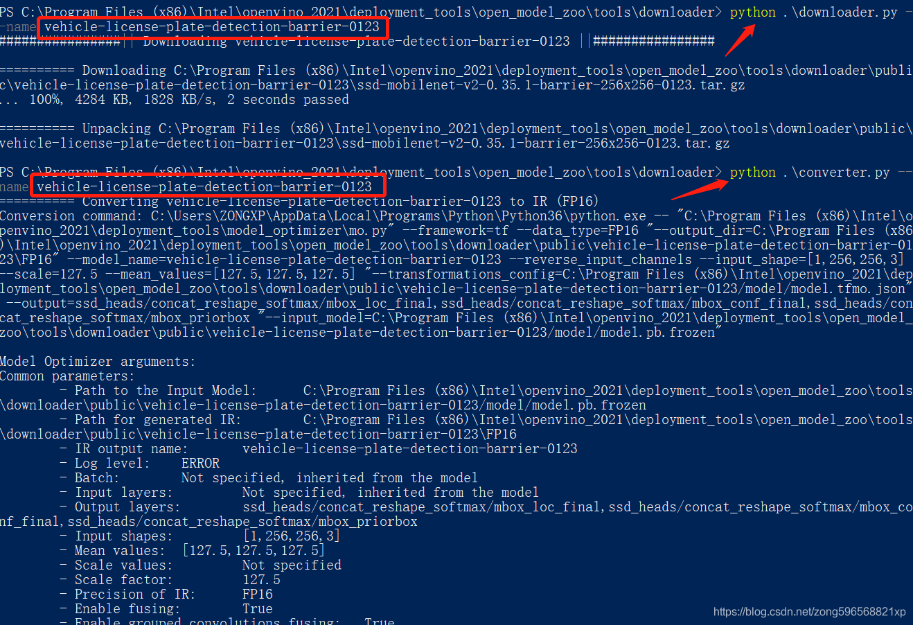 运行指令 python .\converter.py --name license-plate-recognition-barrier-0007,转换成功显示如下,在对应的路径下生成 IR 模型,包含 xml 和 bin 文件