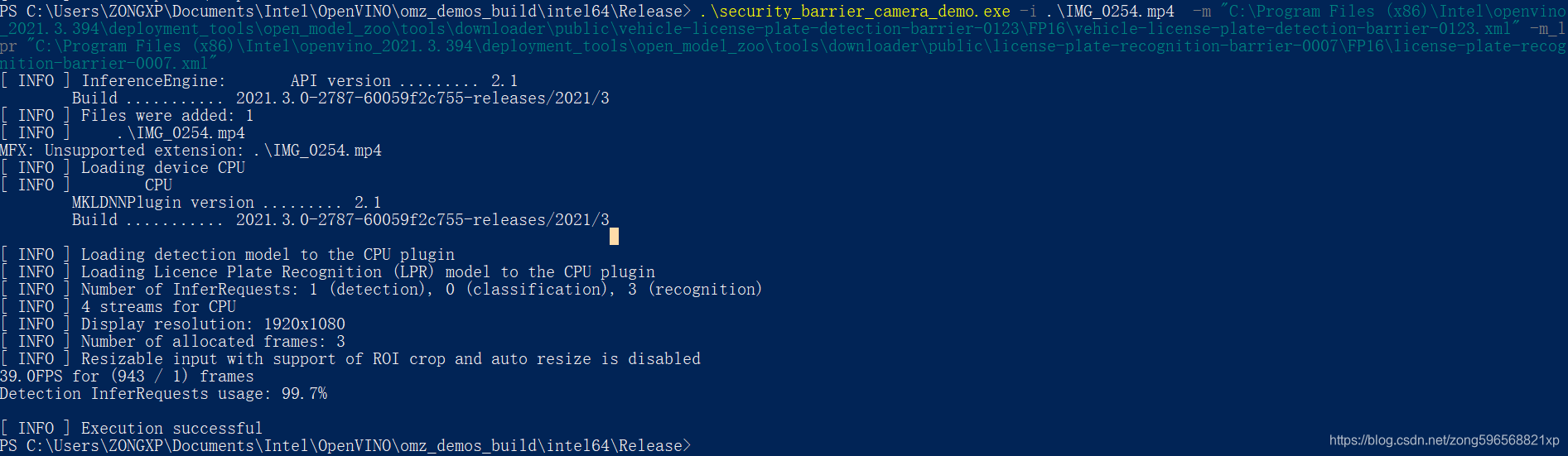 对于车牌识别功能来说,用到的项目是 security_barrier_camera_demo,生成的可执行文件为 C:\Users\ZONGXP\Documents\Intel\OpenVINO\omz_demos_build\intel64\Release\security_barrier_camera_demo.exe