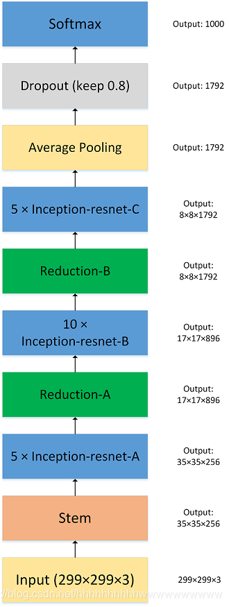 Inception_v4结构相比于前面的版本更加复杂,不仅使用了前面的Inception,同时子网络中嵌套着子网络,作者还尝试了 Residual Connection。Inception_v4的输入是384×384×3