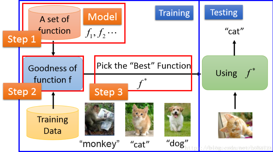3、找出“最好”的函数,如何从众多函数中最快的找出“最好”的那一个,这一步是最大的难点,做到又快又准往往不是一件容易的事情。常用的方法有梯度下降算法,最小二乘法等和其他一些技巧(tricks)。