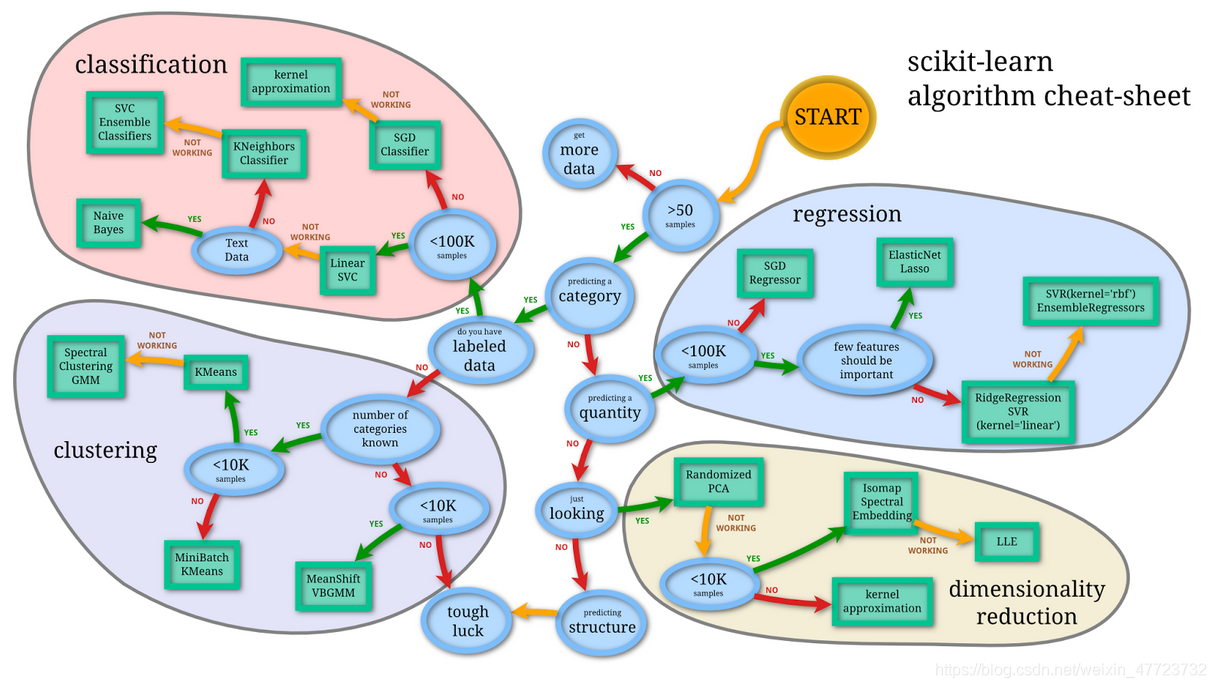 scikit-learn作为一个丰富的python机器学习库,实现了绝大多数机器学习的算法,有相当多的人在使用,于是我这里很无耻地把machine learning cheat sheet for sklearn搬过来了,原文可以看这里。哈哈,既然讲机器学习,我们就用机器学习的语言来解释一下,这是针对实际应用场景的各种条件限制,对scikit-learn里完成的算法构建的一颗决策树,每一组条件都是对应一条路径,能找到相对较为合适的一些解决方法,具体如下:![]()