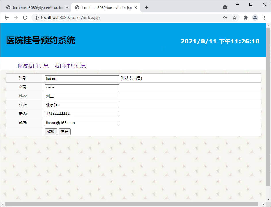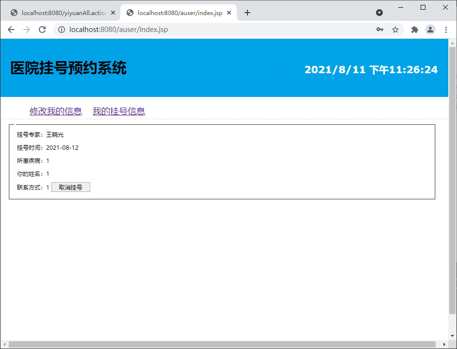 前台基本功能包括:用户注册、用户登录、医院查询、挂号、取消挂号、修改个人信息、退出等。