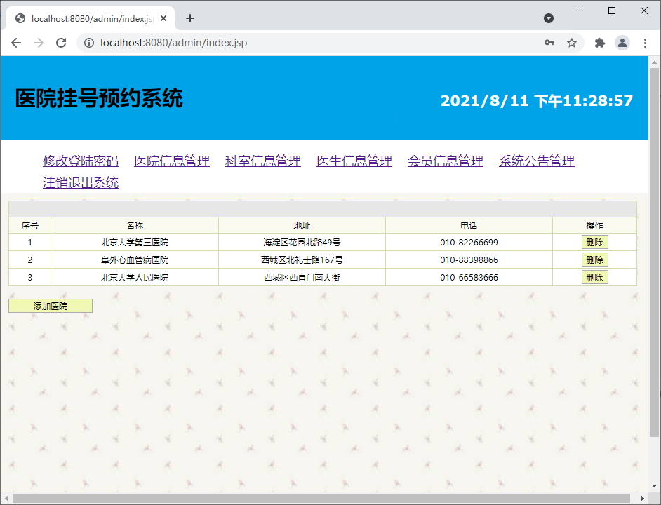 医院管理模块:实现医院的增加、删除功能;