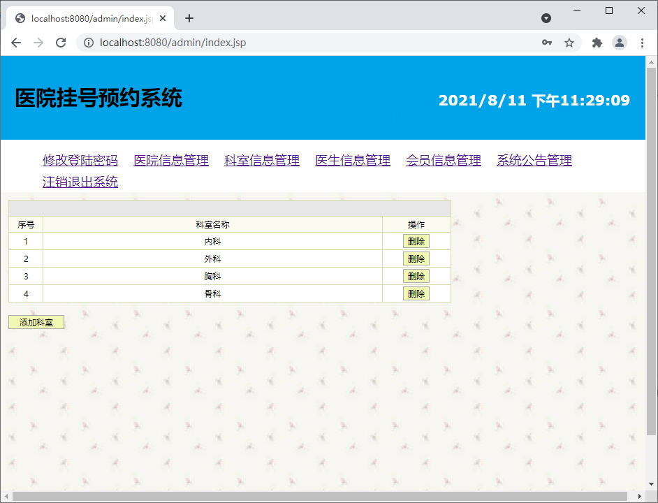 科室管理模块:实现科室的增加、删除功能;
