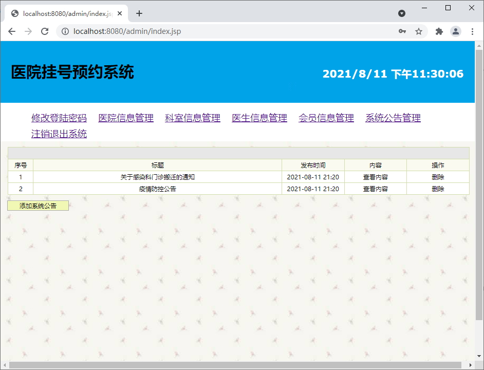 公告管理模块:实现公告的增加、删除功能;