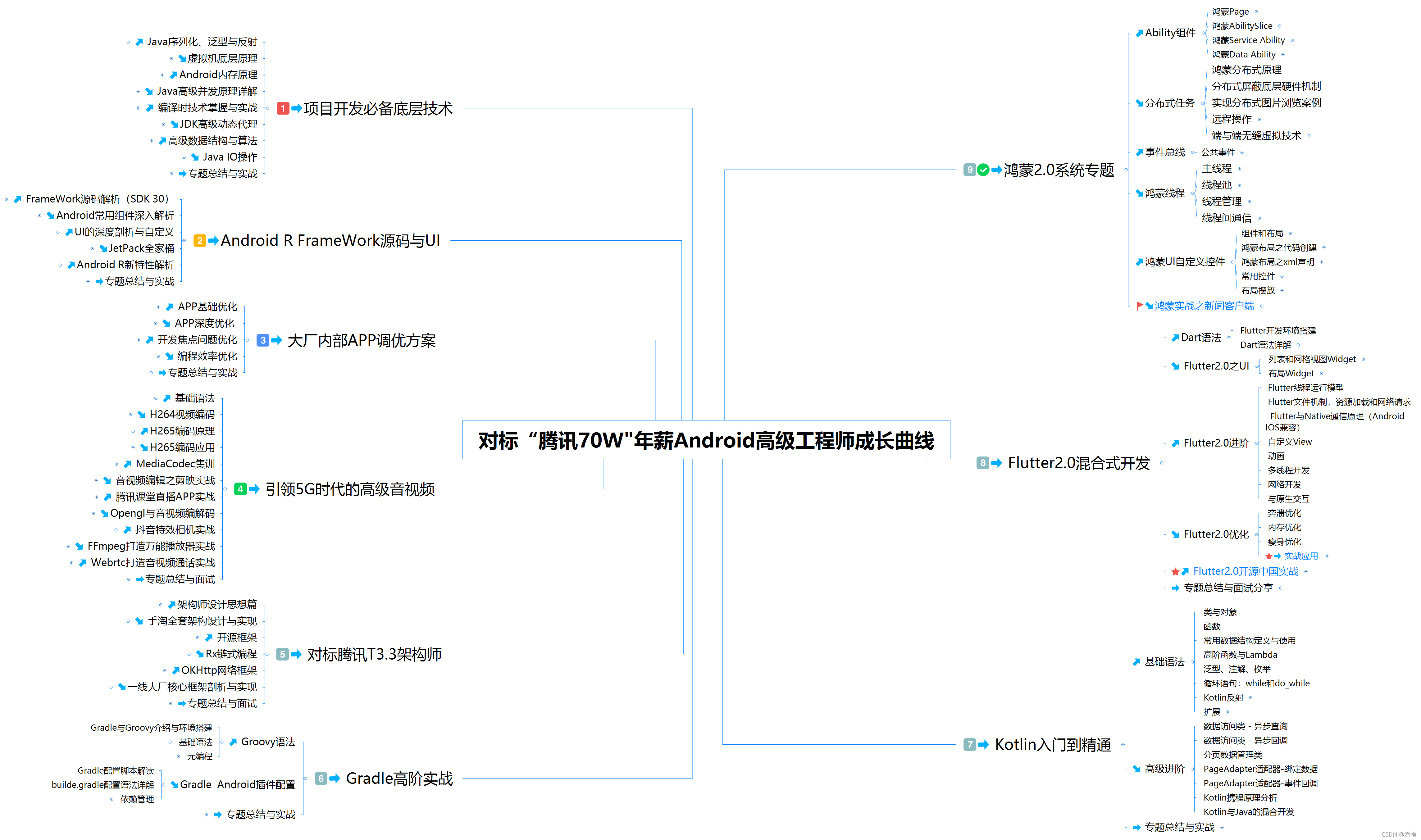 学习方法:学习路线这个是必然的一个东西,一个好的全面的学习路线可以让你得到全面的提升。如果你自己不是到从哪开始整理自己学习路线的话,我这有份参考的学习路线模板,是我之前请几位行业大佬帮忙进行整理的,里面记录的知识点内容很全面,有flutter-kotlin-NDK-Gradle-性能优化-移动架构-UI进阶-音视频开发等内容。你看图就知道的了