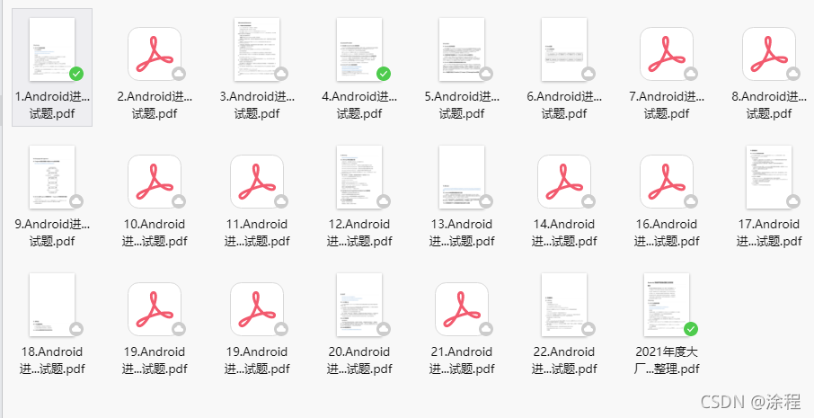 这份文档把大厂面试中常被问到的 技术点整理成了 PDF+知识脉络 + 诸多细节;还有 高级架构技术进阶脑图 帮助大家学习提升进阶,也节省大家在网上搜索文档的时间来学习,也可以分享给身边好友一起学习,大家可以直接去我 CodeChina 地址中:https://codechina.csdn.net/u012165769/Android-T3查阅。