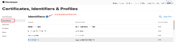 3.申请苹果 App ID (App的唯一标识)。选择页面的 “Identifiers" 可查看到已申请的所有 App 应用标识,点击页面上的加号来创建一个新的应用标识。