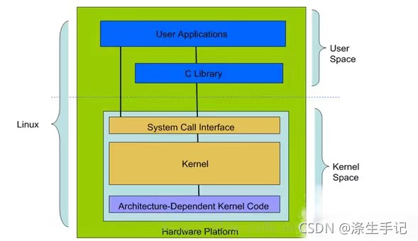 (2)内核空间:内核空间包括,系统调用,内核,以及与平台架构相关的代码