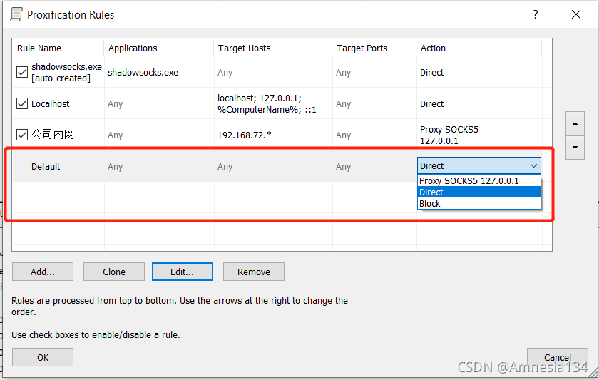 将Default规则,改成Direct直连,因为我们只需要代理192.168.72.*这个ip的请求,其他的网络请求没必要也走公司的网络