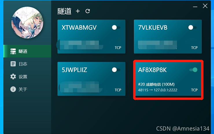 点击按钮启动,此时,已经将电脑A的shadowsocks服务器端口:127.0.0.1:2222 映射为 cn-cd-dx-1.natfrp.cloud:48115