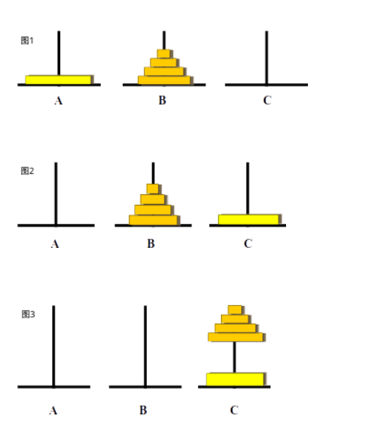 大梵天命令婆罗门把圆盘从下面开始按大小顺序重新摆放在另一根柱子上。并且规定,在小圆盘上不能放大圆盘,在三根柱子之间一次只能移动一个圆盘