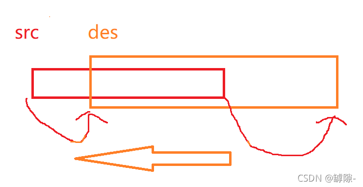 ②分析:拷贝过程出现问题的部分在于重叠部分。若从前往后拷贝,src的内容拷贝到des内时,会将位于des内的src数据覆盖造成数据缺失。所以这种情况下我们从src的后往前拷贝