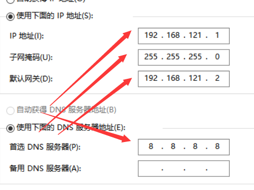 设置ip地址,子网掩码,默认网关和首选DNS服务器。