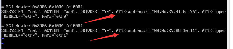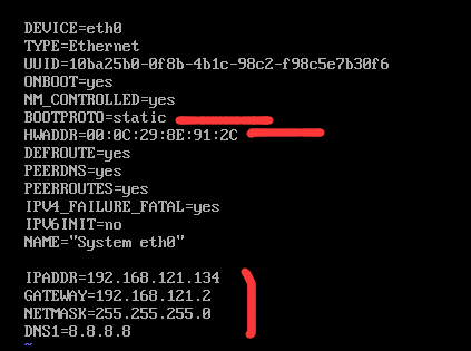 ②将BOOTPROTO处的dchp改为static,HWADDR处的IP改为上一步每一个虚拟机对应的MAC地址。并在下方加入四句话