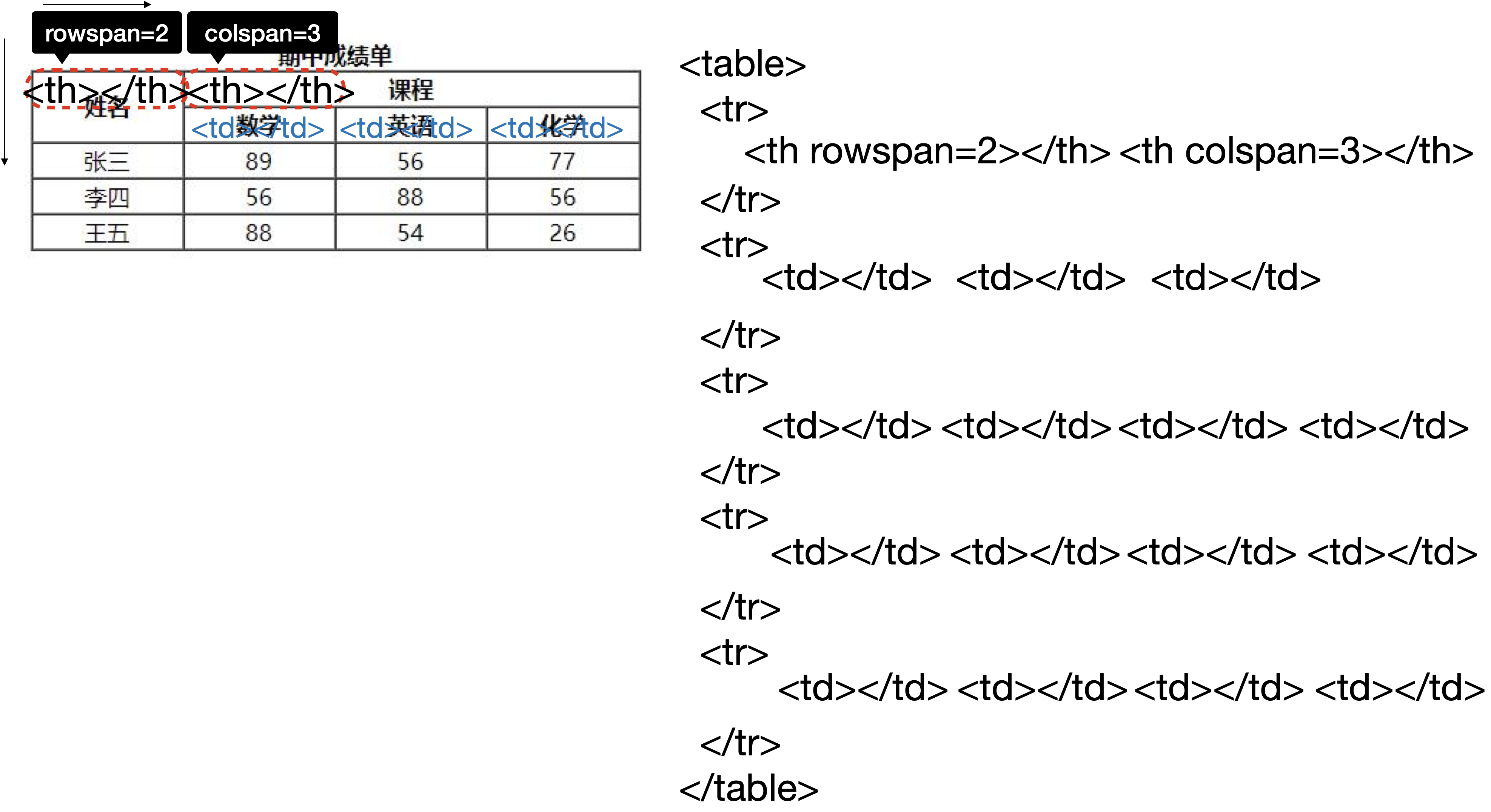 <th rowspan="2">姓名</th> <th colspan="3">课程</th>