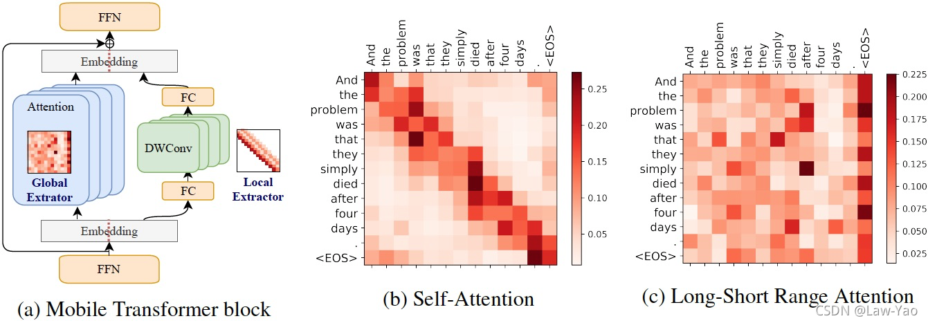 Lite Transformer是一种融合卷积与Self-attention操作的、高效精简的Transformer结构,可应用于NMT、ASR等序列生成任务。其核心是长短距离注意力结构 (LSRA:Long-Short Range Attention)。LSRA将输入Embedding沿Feature维度split成两部分,其中一部分通过GLU (Gate Linear Unit)、一维卷积,用以提取局部Context信息;而另一部分依靠Self-attention,完成全局相关性信息编码。Lite Transformer核心结构如下: