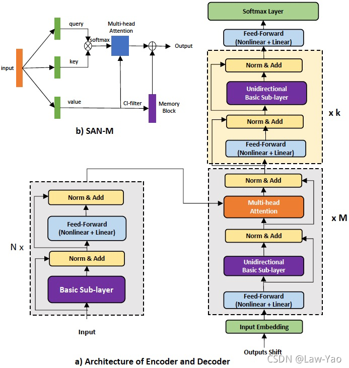 SAN-M表示Self-attention与DFSMN记忆单元的融合,是一种Transformer ASR模型。DFSMN适合捕获局部信息,Self-attention模块具备较强的长时依赖捕获能力,因此二者存在互补性。SAN-M通过将两个模块的特性融合在一起,实现了优势互补。Biasic Sub-layer表示包含了SAN-M的Self-attention layer,DFSMN添加在values后面,其输出与Multi-head Attention (MHA)相加: