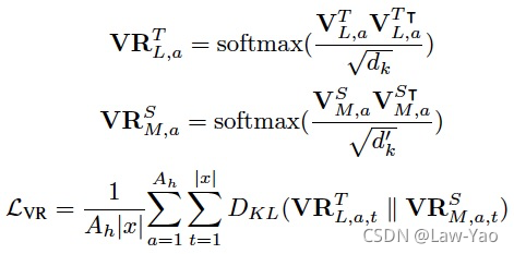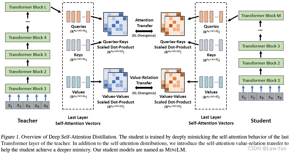 针对NLP任务,深度自注意力知识蒸馏 (Deep Self-Attention Distillation),通过迁移Teacher model最后一层Self-attention layer的Attention score信息与Value relation信息,可有效实现Student model的诱导训练。只迁移最后一层的知识,显得简单有效、训练速度更快,而且不需要手动设计Teacher-student之间的层对应关系。Attention score信息与Value relation信息的知识迁移如下: