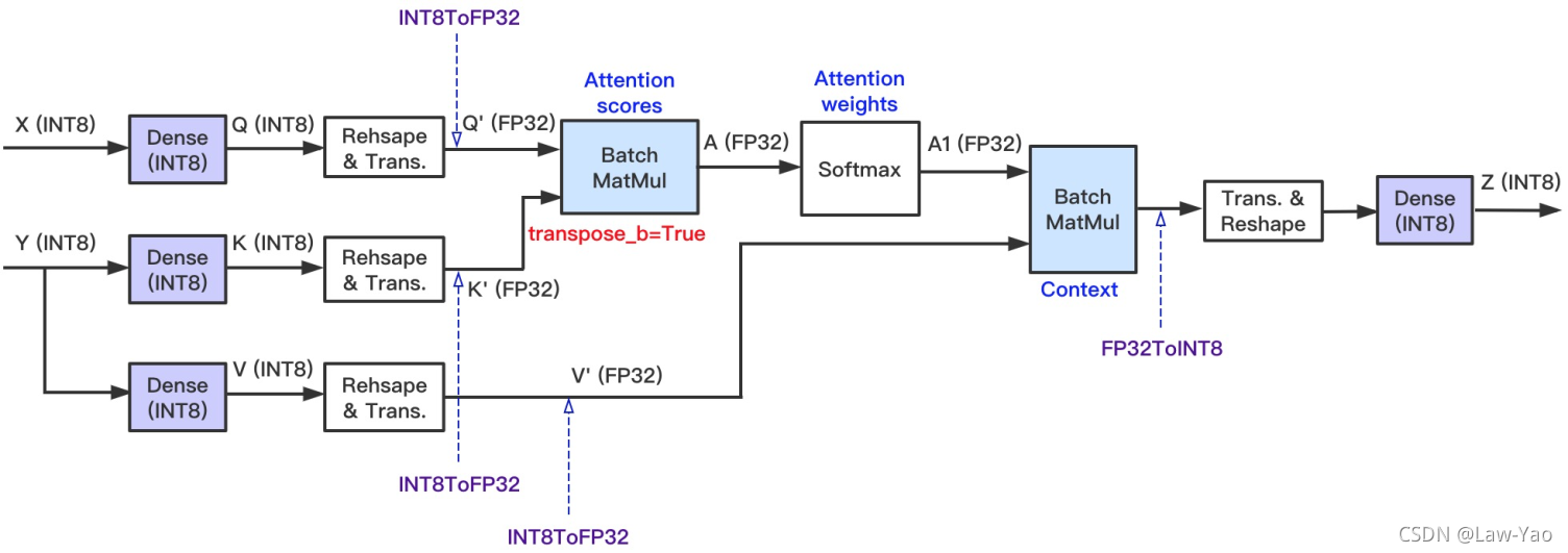 - Reshape与Transpose的操作对象为INT8 Tensor,节省内存开销: