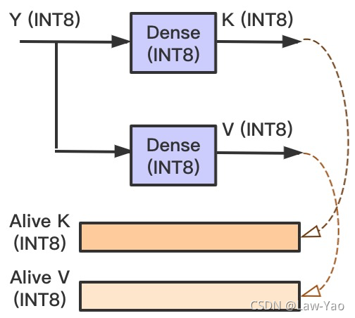 - k_dense与v_dense的输出会添加到Cache,按照INT8类型搬运数据,可节省访存开销: