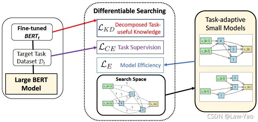 针对NLP任务,AdaBert通过可微分搜索、与知识蒸馏,实现卷积类型的NLP模型搜索: