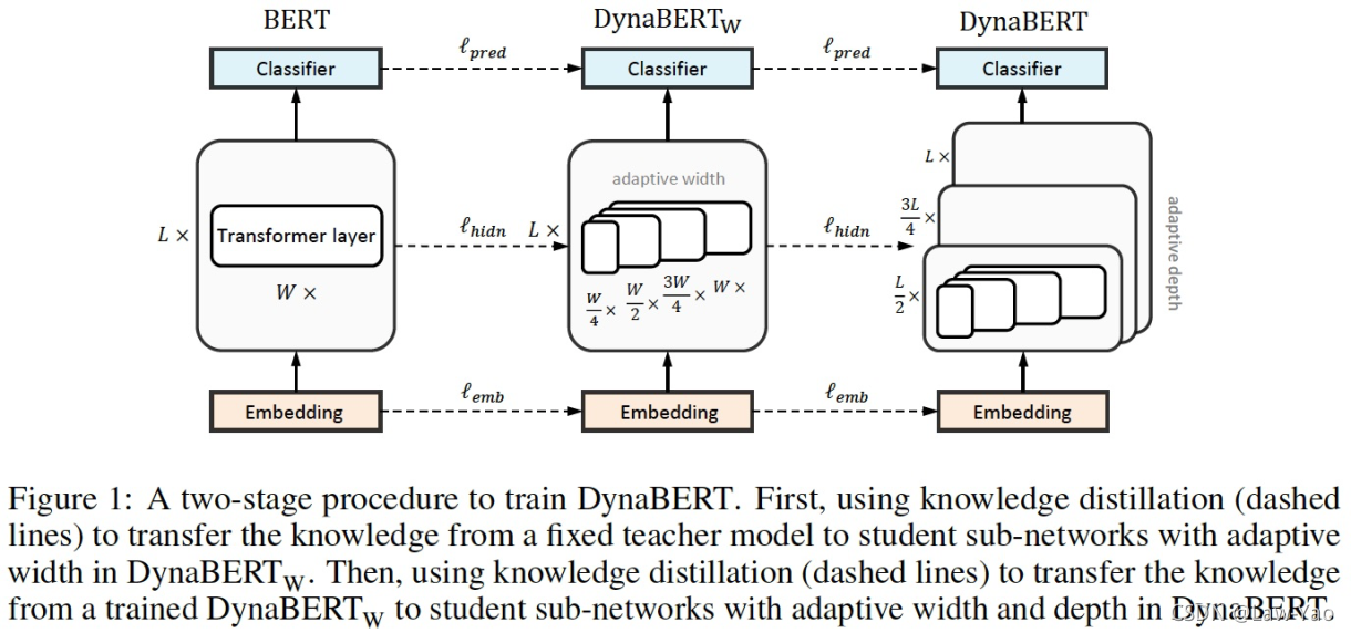 针对NLP任务,DynaBert模型压缩策略可实现多个维度的压缩搜索(主要是Width与Depth维度)。通过动态可伸缩性质的One-shot NAS:首先基于预训练Bert模型(或其变体),进行多维度正则化训练;正则化训练之后,按照不同的资源约束需求,能够进行网络参数的裁剪、以获得子网络,并进行子网络的微调训练;从正则训练、到子网络微调,可协同知识蒸馏训练。主要步骤描述如下: