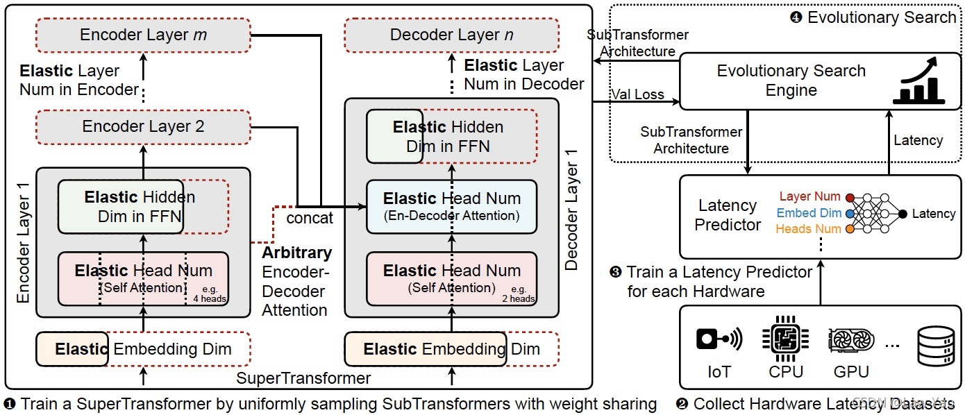 - 搜索空间:Encoder-decoder Attention的任意连接方式,以及Transformer layer内部结构(Attention head数目、Width等);