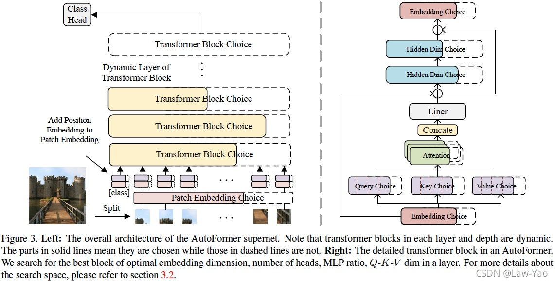 AutoFormer总体思路如上图所示,是一种基于Weight entanglement的动态可伸缩搜索方法,其搜索维度包括Attention heads、通道宽度与网络深度。下面从搜索空间、搜索策略与搜索效率这些维度加以分析: