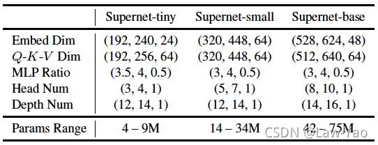 - 搜索空间:Embedding dimension、O-K-V dimension、Attention heads、MLP ratio与Network depth;根据不同的资源约束,分别设置Supernet-tiny、Supernet-small与Supernet-base三个基本的Template model;