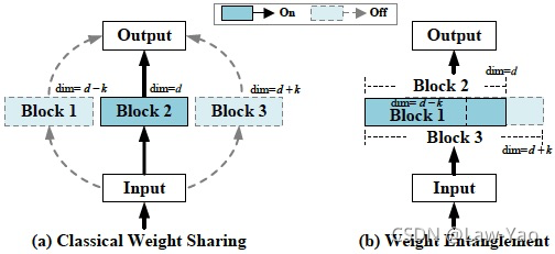 而每个Block结构,都是按照Weight entanglement原则从超网络采样获得,下式表示n个动态选择范围:
