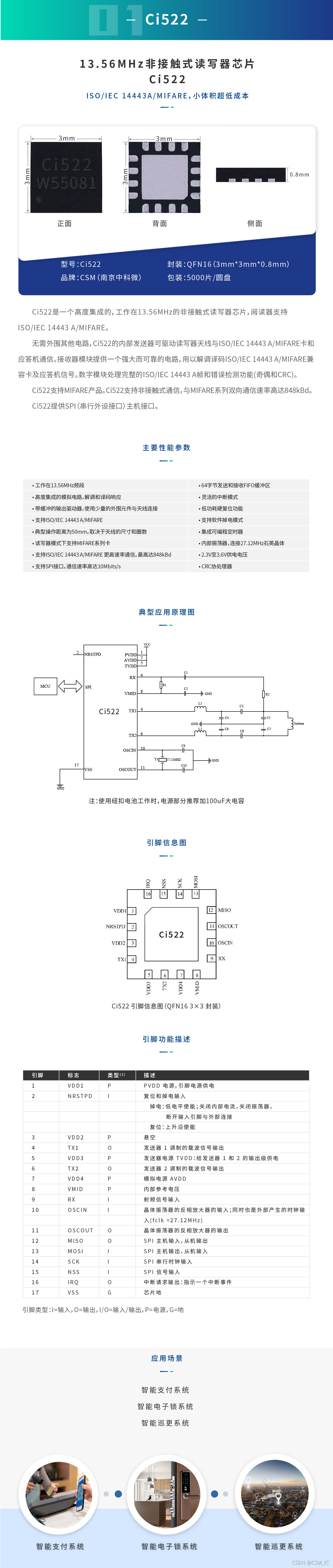 13.56MHz 非接触式读写器芯片--Ci522(A卡,小体积超低成本)