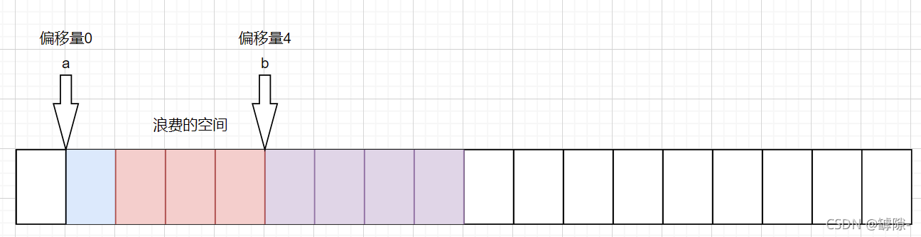 ①a作为第一个成员,创建在结构体偏移量为0的地址,即结构体的起始地址。占用内存一字节。