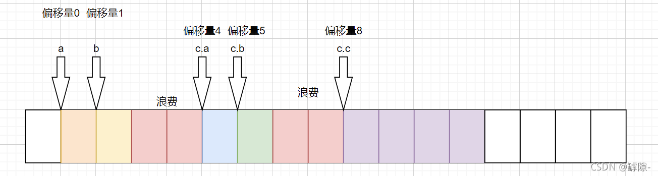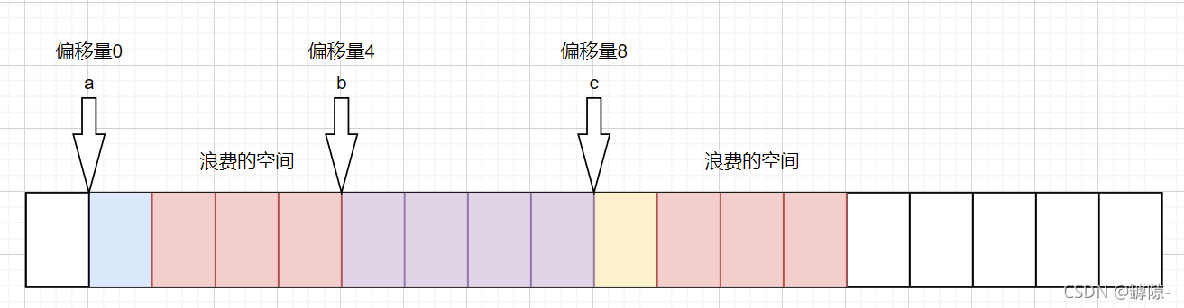③c作为第三个成员。c的类型为1,偏移量8当然是1的倍数啦,所以c随即在b的后方开辟空间。但由于规则三,现在的总大小为9,并不是最大对齐数(每个成员的对齐数之间)4的倍数,所以又在后面浪费了3个字节使得总字节为12。