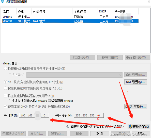 因此,在编辑Centos7的网络地址的时候,需要找到自己的网络地址,可以通过子网掩码进行确认几类网络地址,之后通过VM-编辑-虚拟机网络编辑进行修改,即:
