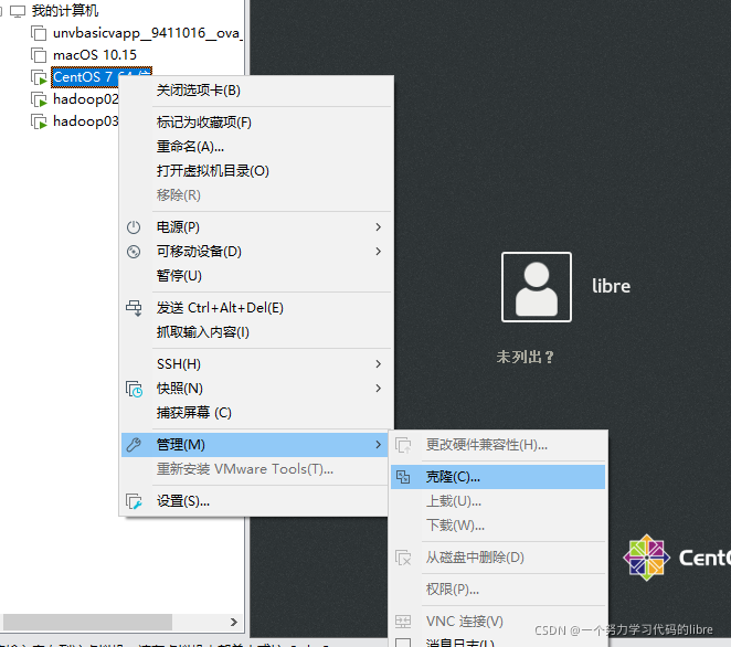 然后,右键虚拟机,选择管理-克隆-完整克隆(注意不要把克隆机放在C盘,不然你会发现C盘又被占用了点空间),如图: