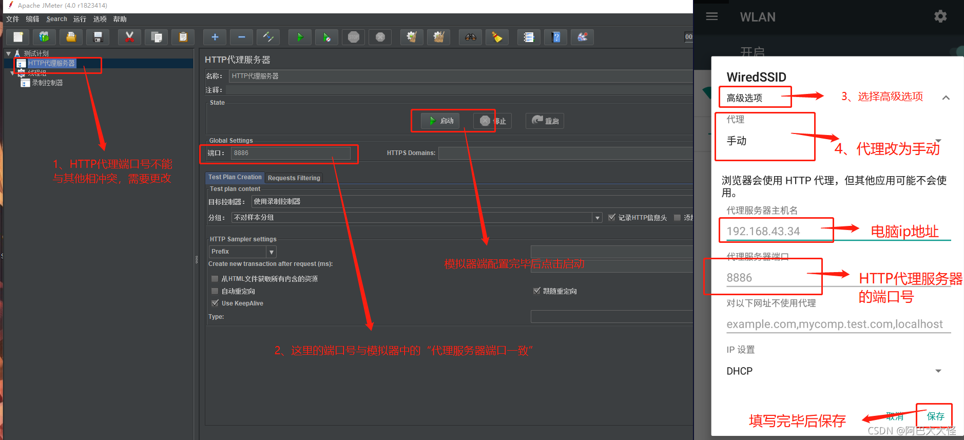 5、高级选项-代理改为手动-电脑ip地址-HTTP代理服务器中的端口号 如下图所示,然后保存