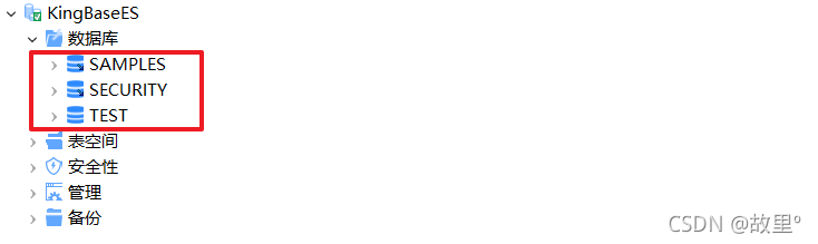 KingbaseES数据库初始化过程会创建一个数据库实例。KingbaseES创建数据库实例时会自动创建数据库:SAMPLES、SECURITY和TEST。每个数据库中可以包含多个数据库对象,如表、索引、序列等。