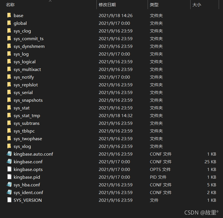 data目录包含几个子目录以及一些控制文件,如表"data目录下的内容"所示。除了这些必要的东西之外,kingbase.conf、sys_hba.conf和sys_ident.conf通常都存储在data中,但也可以将其存放在地方。