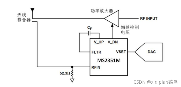 无线设备很多情况下需要对发射功率的增益做控制,因此首先需要检测功率,然后将这个检测到功率反馈给控制系统以形成闭环控制。之前在检波器芯片市场上多以美系品牌为主,现在我们国产品牌瑞盟电子也推出了其对数放大器芯片MS2351M,它有两种主要的工作模式,测量模式和控制模式,当MS2351M工作于控制模式时基本的连接方式如下图所示: