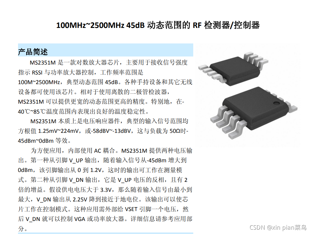 MS2351M 100MHz~2500MHz 45dB 动态范围的RF检测器/控制器