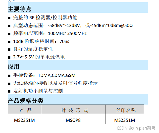 MS2351M是瑞盟科技一款对数放大器芯片, 主要用于接收信号强度指示RSSI与功率放大器控制, 工作频率范围是100M~2500MHz, 典型动态范围45dB。 各种手持设备和其它无线设备都可使用该芯片。 相对于使用离散的二极管检波器,MS2351M可以提供更宽的动态范围更高的精度。特别地, 在-40℃~85℃温度范围内表现出良好的温度温定性。