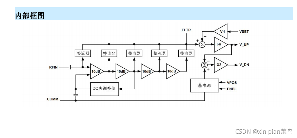 在该控制系统工作时,我们从耦合器获得检波器的输入信号,在检波器内部,该电平与MCU等控制模块输出的DAC的电平Vset做比较,如果耦合信号电平超过Vset电压时,V-DN减小,使得功率放大器的输出也减小,最终使得耦合信号产生电平与Vset达到平衡。