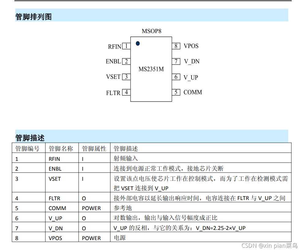 为方便应用, 内部使用AC耦合。MS2351M提供两种电压输出。 第一种从引脚V_UP输出, 随着输入信号从-45dBm增大到0dBm, 该引脚输出从0到1.2V, 这时的输出可工作在测量模式。 第二种从引脚V_DN输出, 它是V_UP电压的反相, 且有2倍的增益。 假设供电电压大于3.3V, 那么随着输入信号由最小到最大, V_DN输出从2.25V降到接近于地电位。 该输出可以使芯片工作在控制模式。 这种应用需外部给VSET引脚一个电压, 然后V_DN就可以控制VGA或功率放大器。