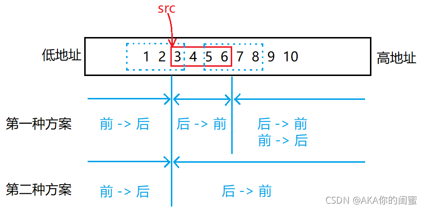 当目标空间在源空间的后边时,从后向前拷贝,当目标空间在源空间的前面时,从前向后拷贝。