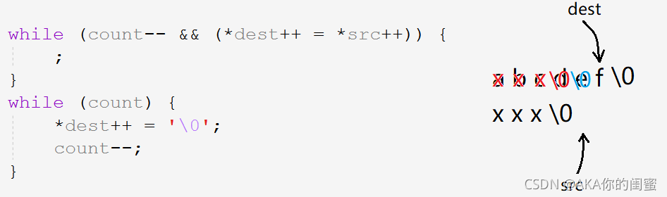 - 若源空间和目标空间有重叠,则拷贝时会覆盖源字符串内容。