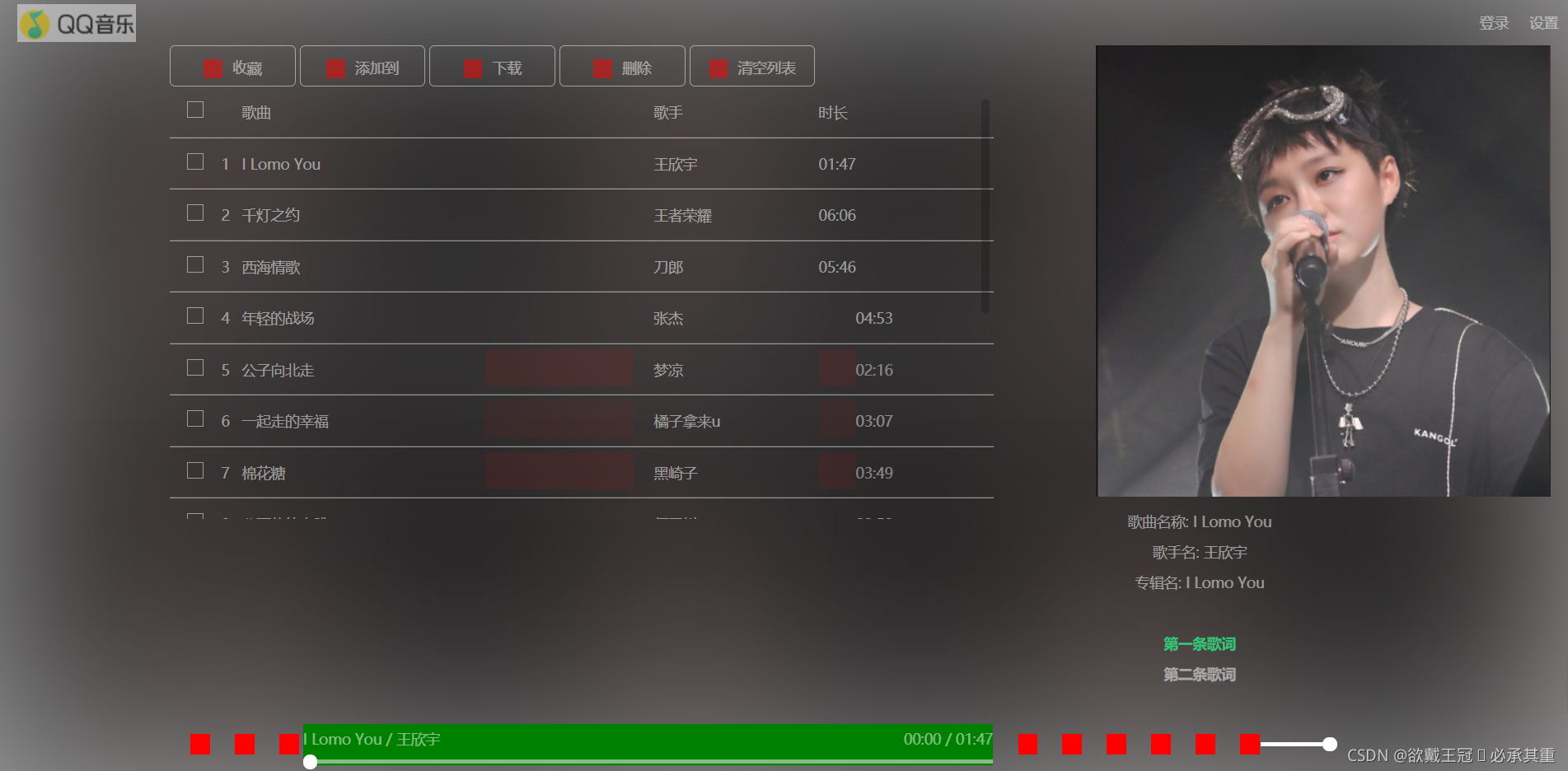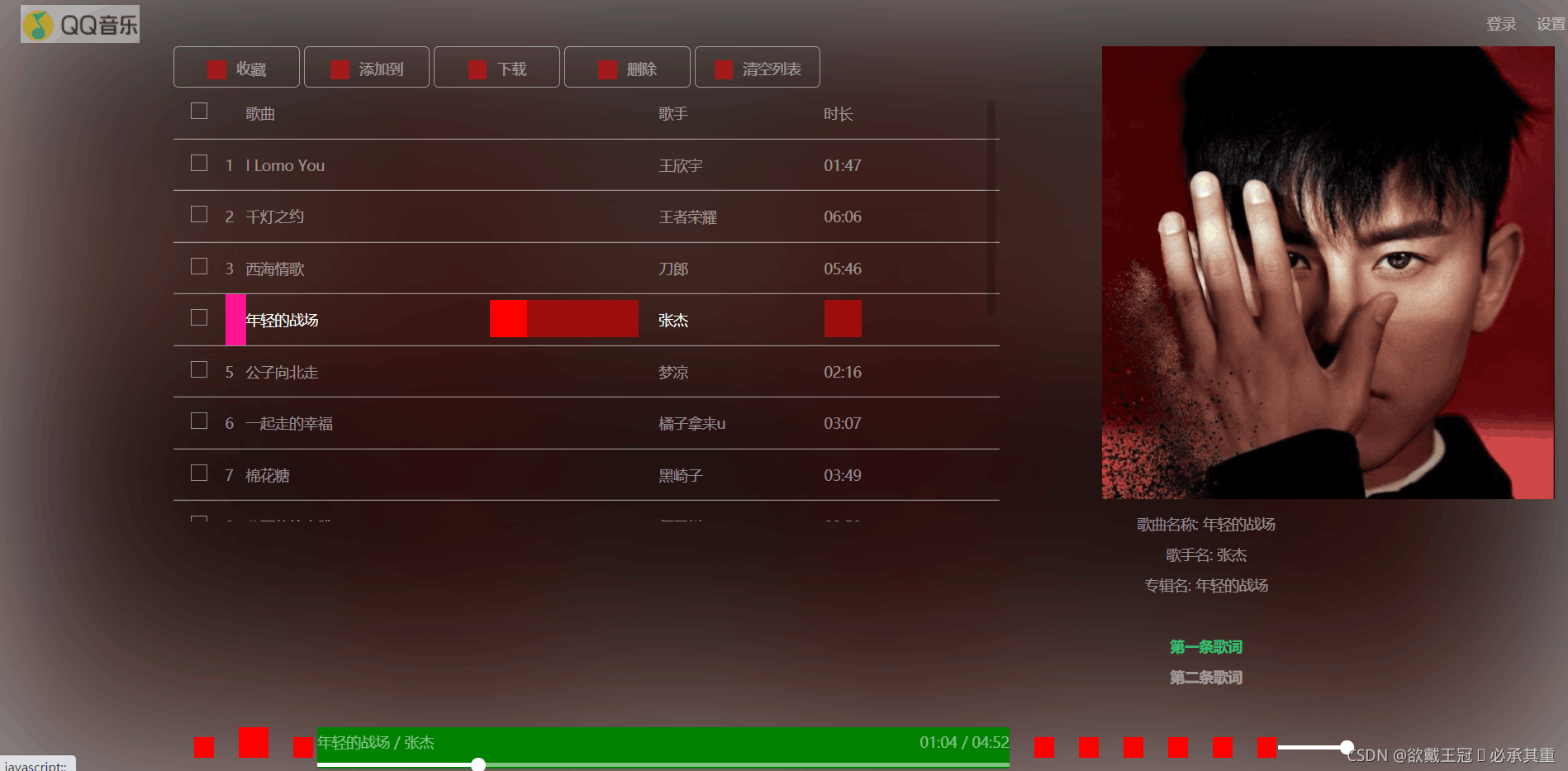 还有就是歌词同步问题,由于当时我找不到相应歌曲的歌词文档,所以我就省了这一步骤。你们如果有歌词文档的话,把歌词封装成一个数组,然后导入,添加一个js就可以了。