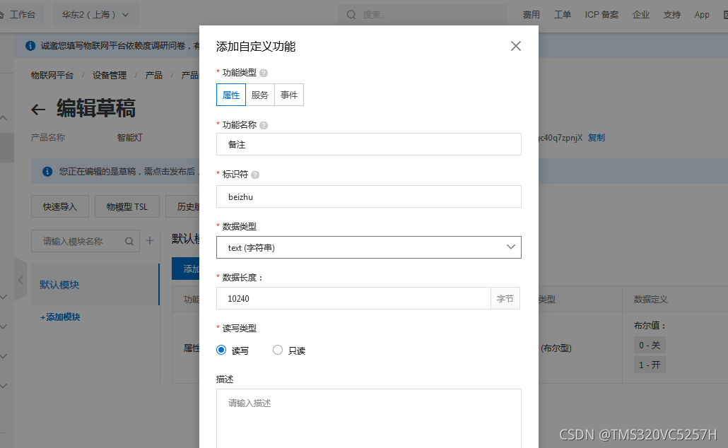 接下来发布上线,上线之后就可以添加很多具备这两个属性的设备了。一个产品是一类设备的统称。