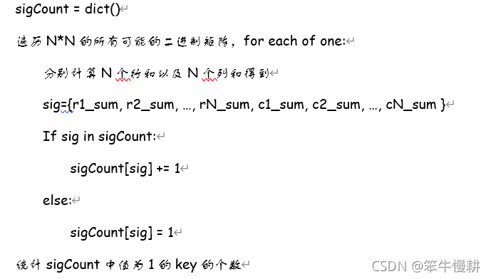 对N*N的所有可能的二进制矩阵进行N行和N列的,所得的2*N个值形成的排列{r1_sum, r2_sum, …,rN_sum, c1_sum, c2_sum, …, cN_sum }构成这个矩阵的signature。然后查询值对应唯一的矩阵的signature的个数。可以在遍历所有矩阵时,对各种signature出现的次数进行计数,最后计数值为1的signature个数即为所求结果。signature出现的次数可以用哈希表来存储,在python中就是dict()。