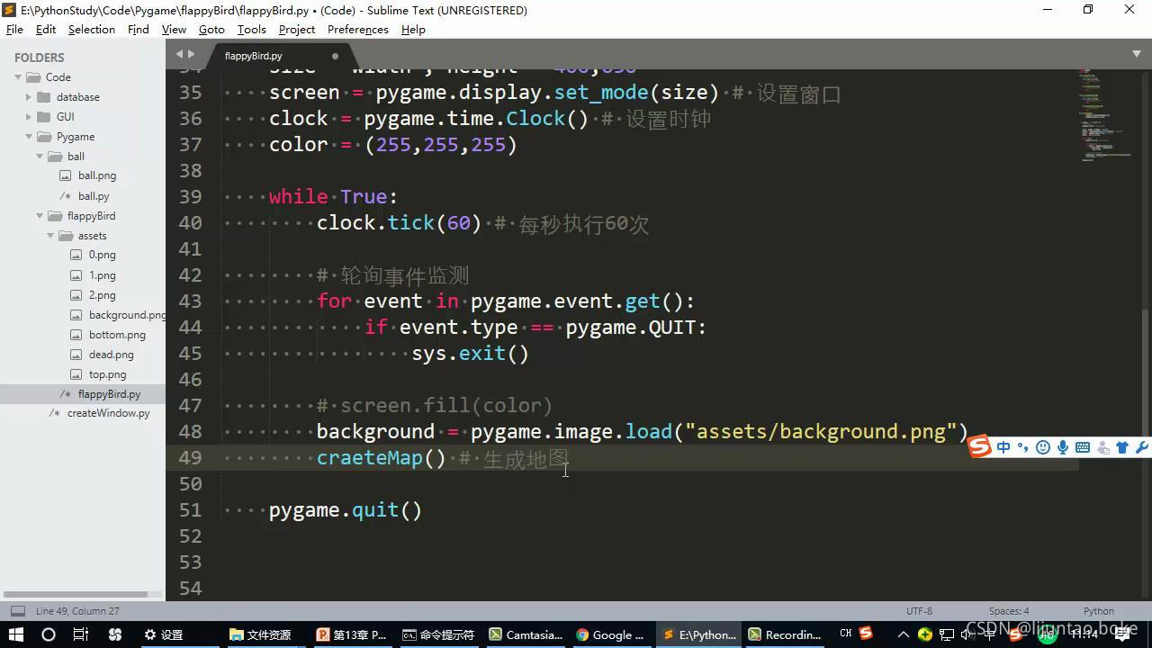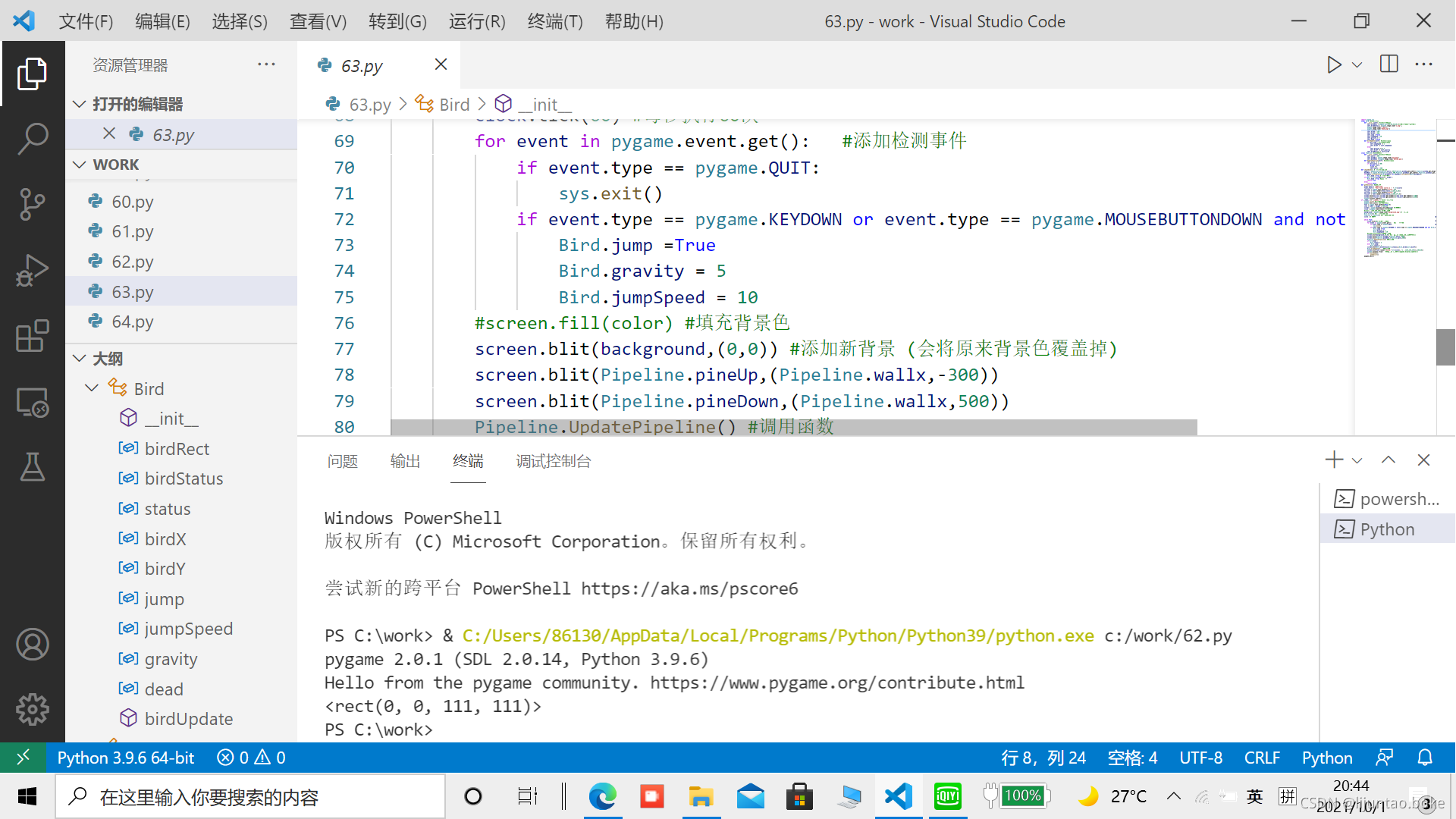根据物理的参照物的知识,我们可以用管道的移动造成小鸟移动的视觉效果,